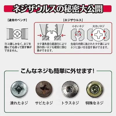 - バイス機構がネジを掴んでロックするため、固く締まったネジでも、少ない力で回せます。