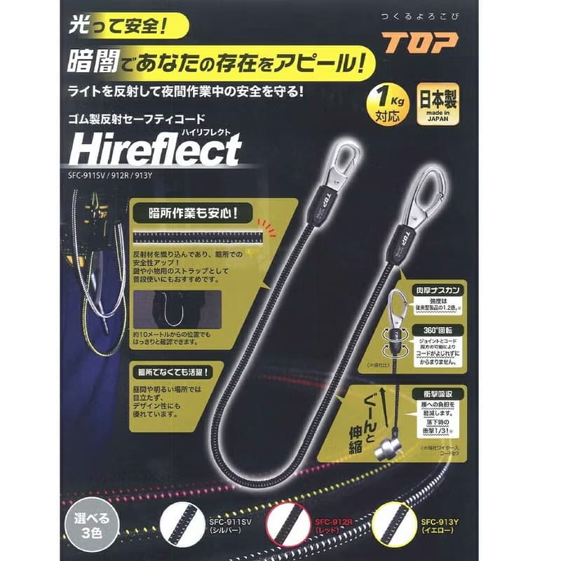 有名工具メーカー・TOP工業より、ゴム製の反射セーフティコードが発売されました。「ゴム製」かつ「光を反射する」セーフティコードは業界初の商品です。高所作業での工具落下防止や紛失防止に。