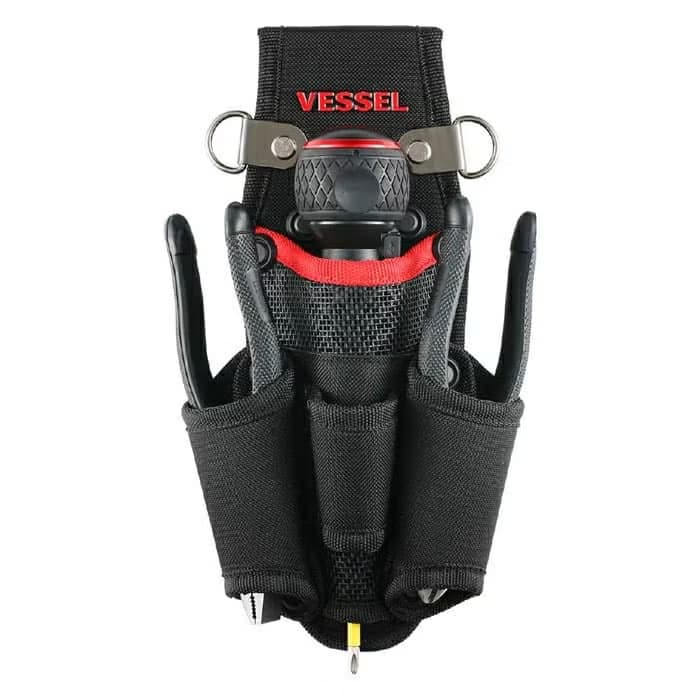 フックとベルト通しのどちらでも装着、ドライバー2本とペンチ2本を収納できる、工具差しです。