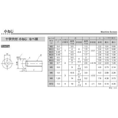 十字穴の付いたナベ頭の小ネジです。頭部は丸みを帯びており、座面は平らです。
